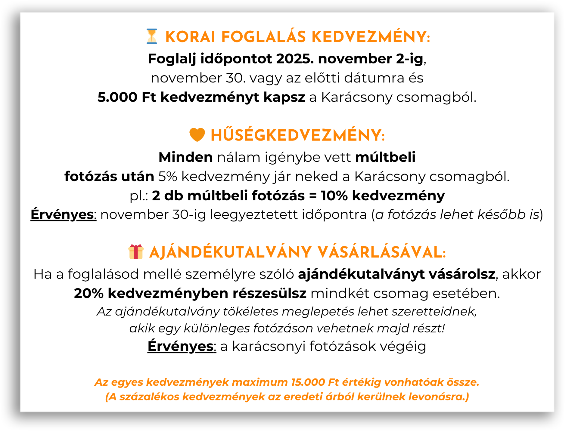 Sokatok idén is várta, hogy mikor kezdődnek már el a karácsonyi fotózások! Belegondolva vicces, hogy már szeptember elején ezen kellett gondolkodni, de az igényeknek eleget kell tenni, így hát 2025-ben is várok sok szeretettel minden kedves érdeklődőt egy kellemes hangulatú karácsonyi fotózásra a megújult jászárokszállási stúdióban! 😊 Amennyiben Budapesten szeretnél karácsonyi fotózáson résztvenni, arra is van lehetőség, arról privát üzenetben érdeklődj!